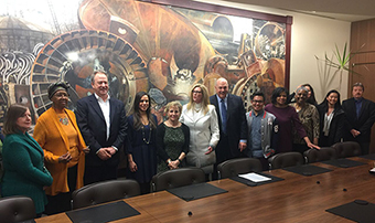 Sally Greenberg (5th from left), Executive Director of the National Consumers League, gets a friendly reception from community leaders, executives, and staff at the Bank of Labor